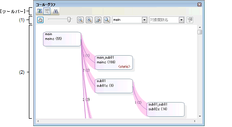 なお,コール・グラフを表示するための操作手順は,「2.4 関数間の呼び出し関係(コール・グラフ)を表示する」を参照してください。