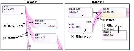 ある関数から別の関数を静的に呼び出している場合,双方の関数ボックス間に接続線を表示します。