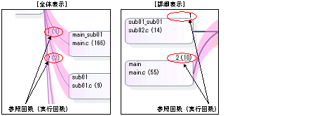 選択している関数([対象関数名]コンボ・ボックスで指定している関数)に対する親関数と子関数を表示する詳細表示にコール・グラフを切り替えます。