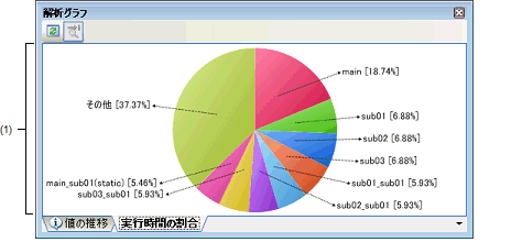 - | [表示]メニュー→[プログラム解析]→[解析グラフ]→[実行時間の割合]タブの選択 |