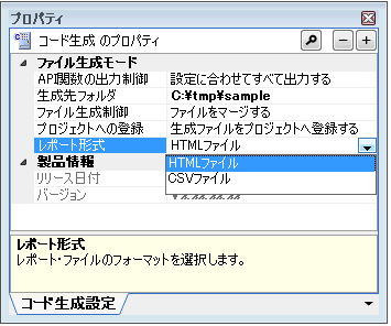 コード生成では,プロパティ パネルの[コード生成設定]タブ→[ファイル生成モード]→[レポート形式]でレポート・ファイルの出力形式(HTMLファイル,CSVファイル)を変更することができます。