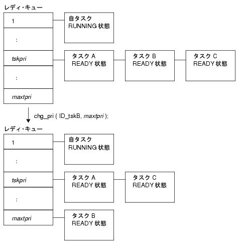 tskpriで指定された優先度に対応したレディ・キューの最後尾にキューイングし直す処理もあわせて実行されます。