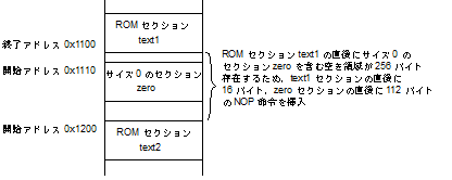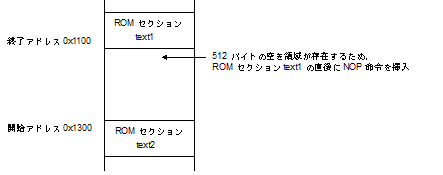 ROMセクションとRAMセクションは,ROMセクションより大きいアドレスにRAMセクションが配置された場合に限り,NOP命令を挿入します(ROMセクションより小さいアドレスにRAMセクションが配置された場合はNOP命令を挿入しません)。 |