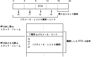 たとえば,サイズが20バイトの構造体引数を値渡しする場合,16バイトはr6〜r9 で,残りの4バイトはスタック(5 番目のパラメータ・ワード)として渡されます。
