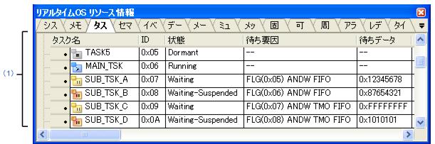 なお,タスクの現在状態がイベントフラグ待ち状態,データ送信待ち状態,可変長メモリ・ブロック待ち状態以外の場合には,“--”が表示されます。