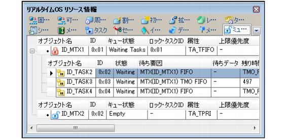 ミューテックスの待ちキューにタスクがキューイングされている場合に限り,待ちタスク情報(オブジェクト名,IDなど)を表示します。
