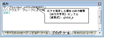 出力 パネルの[デバッグ・ツール]タブでは,指定した変数式の値が次のように出力されます(「図 A.37 Printfイベントの出力結果フォーマット」参照)。