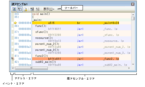 なお,各エリアの見方,および機能についての詳細は,逆アセンブル パネルの項を参照してください。