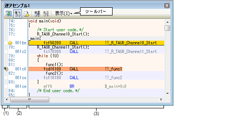 ダウンロードしたプログラム(メモリ内容)の逆アセンブル結果(逆アセンブル・テキスト)の表示は,次の逆アセンブル パネルで行います。