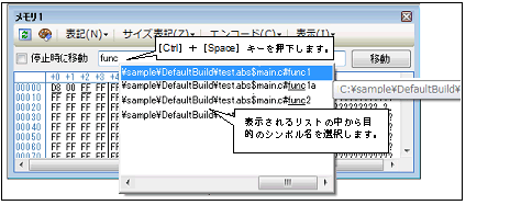 シンボル名の入力補完とは,アドレス式などを入力する際に,プログラム中に存在するシンボル名のリストから1つを選択することにより,ユーザのシンボル名の入力作業を補佐する機能です。