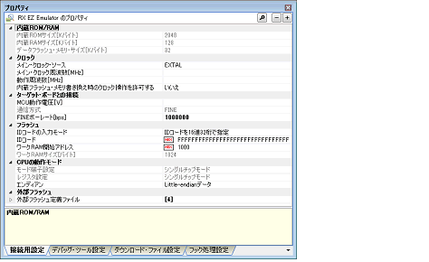 EZ Emulatorを使用する場合の動作環境の設定を次のプロパティ パネルで行います。