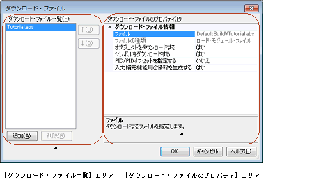 ダウンロード・ファイル ダイアログは,プロパティ パネルの[ダウンロード・ファイル設定]タブ上の[ダウンロード]カテゴリ内[ダウンロードするファイル]プロパティを選択することで欄内右端に表示される[...]ボタンをクリックするとオープンします。