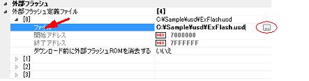 USDファイルを登録すると,サブプロパティとして[開始アドレス]/[終了アドレス]/[ダウンロード前に外部フラッシュROMを消去する]プロパティが追加表示されます。