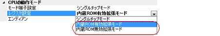 外部フラッシュ・メモリへダウンロードする場合,デバッグ・ツールと接続する際にマイクロコントローラの動作モードを設定する必要があります。プロパティ パネルの[接続用設定]タブにおける[CPUの動作モード]【E1】【E20】【EZ Emulator】カテゴリ内の[レジスタ設定]プロパティをプルダウン・リストにて次のように[内蔵ROM有効拡張モード]または[内蔵ROM無効拡張モード]に変更します。