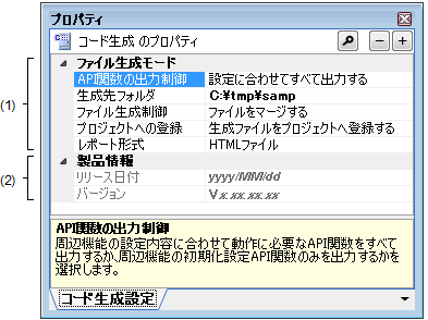 プロジェクト・ツリー パネルで選択した[コード生成(設計ツール)]に関する情報(API関数の出力制御,生成先フォルダ,ファイル生成制御,プロジェクトへの登録,レポート形式)の表示,および設定の変更を行います。