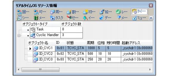 備考  周期ハンドラ情報(オブジェクト名,IDなど)の各セルをダブルクリックした際には,周期ハンドラのソース・ファイルをエディタ パネルに表示し,該当部にキャレットを移動します。