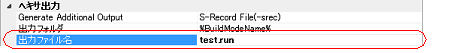 [ヘキサ出力]カテゴリの[出力ファイル名]プロパティにおいて,変更するヘキサ・ファイル名を入力してください。