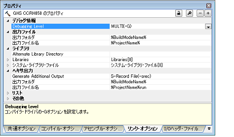 リンク・フェーズに対するオプションを設定するには,プロジェクト・ツリーでビルド・ツール・ノードを選択し,プロパティ パネル[リンク・オプション]タブを選択してください。