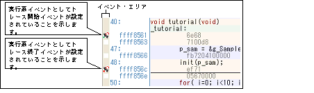 エディタ パネル/逆アセンブル パネルにおいて,トレース・データの収集を開始/終了するイベントを設定します。