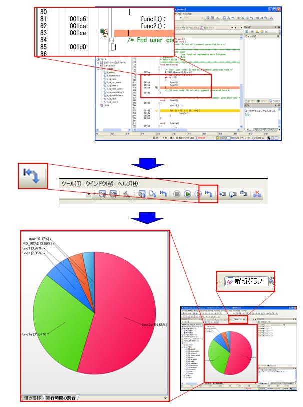 実行時間の割合を表示する解析グラフは,トレース・データ(CPUの実行履歴)を元に描画されます。