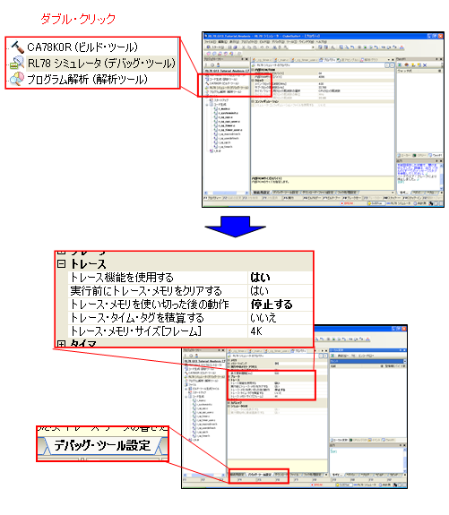 下図のようにデバッグ・ツールのプロパティで「トレース・メモリを使い切った後の動作」を「停止する」に設定してください。 |