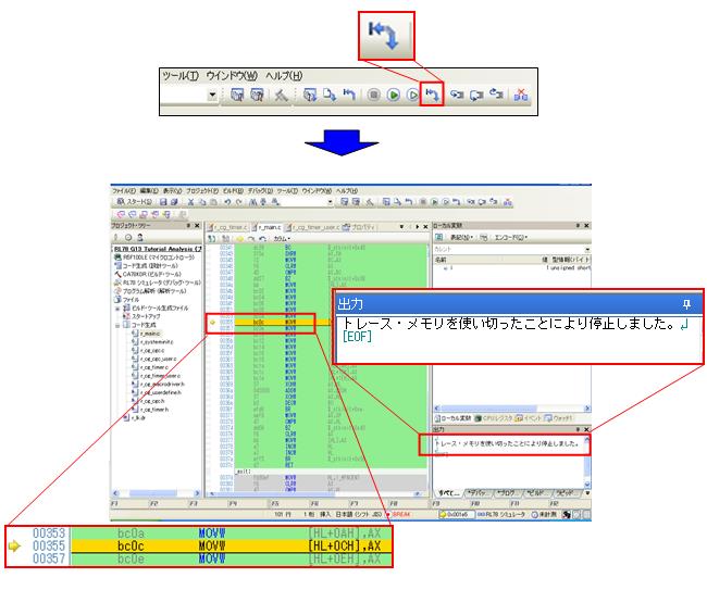 トレース・メモリを使い切ったことによって,プログラムの実行が停止します。しかし,ブレーク・ポイントまでプログラムの実行が到達していないことが分かります。 |