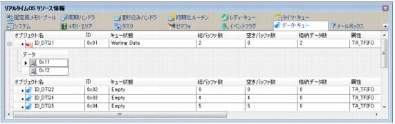 データ・キューにタスクがキューイングされている場合に限り,送信待ちタスク/受信待ちタスク情報(タスク名,IDなど)を表示します。