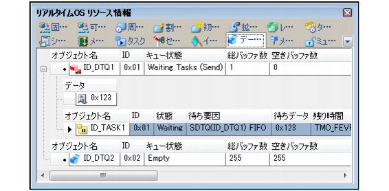データ・キューにタスクがキューイングされている場合に限り,送信待ちタスク/受信待ちタスク情報(オブジェクト名,IDなど)を表示します。