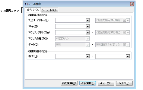 なお,タブ選択エリア上のタブを選択することにより,命令レベル,またはソース・レベルでトレース・データを検索することができます。