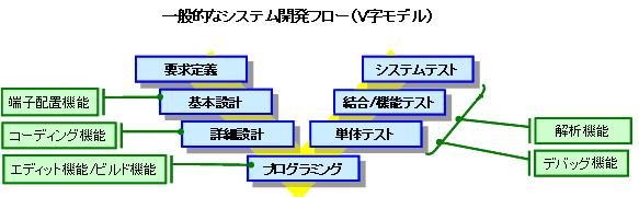 一般的なシステム開発の流れ(V字モデル)に対して,CS+が提供する機能の対応関係を示します。