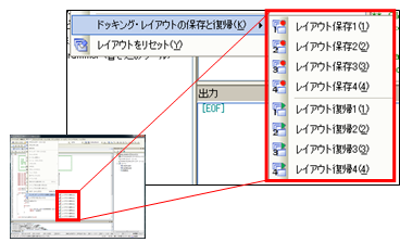 レイアウト(パネルの配置情報)は、メニューバーの「表示」→「ドッキングレイアウトの保存と復帰」で、デバッグツール接続前/接続後のそれぞれに対して、4つの状態を保存することができます。