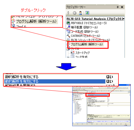 解析機能を使用するには,ビルド・ツールにて解析用の情報を出力する必要があります。解析ツールのプロパティにて「静的解析を有効にする」と「動的解析を有効にする」を「はい」に設定後,ビルドを行ってください。(サンプル・プロジェクトは,「はい」の設定にしてあります。)