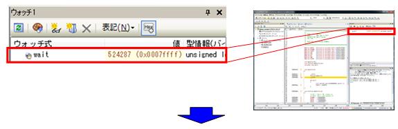 数秒ほど経過するとアクセスブレークが発生し、ウォッチウインドウのwait値が0x7ffffになります。
