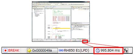 waitは約1秒をカウントアップしますので、プログラムの実行時間は約1秒となるはずです。実行時間の計測結果は、ステータスバーに表示されます。