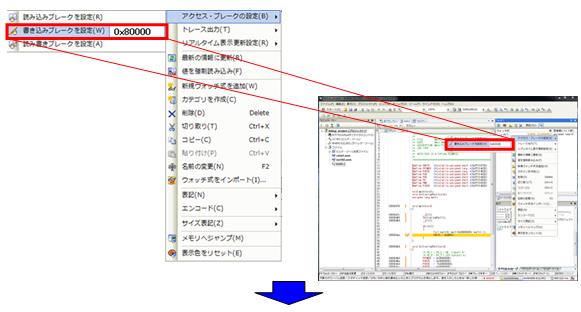 ウォッチパネルのwaitが表示されている行上で右クリックして、[アクセスブレークの設定]→[書き込みブレークを設定]を選択し、0x80000を入力してEnterキーを押下してください。