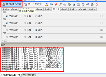 コード生成で周辺機能の設定が終了しましたら、「端子配置へ反映」ボタンを押下してください。端子配置(設計ツール)を使うRL78/G12, RL78/G13, RL78/G14, RL78/I1A, RL78/G1A, RL78/L12, RL78/F12, RL78/F13, RL78/F14, RL78/F15の場合、この操作が必要です。