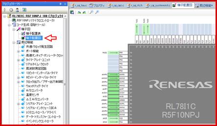 端子配置図パネルを開いてください。マイコンの種類によって、プロジェクト・ツリーに「端子図」が表示されます。