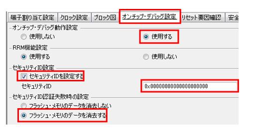 [オンチップ・デバッグ設定]タブ内を以下のように設定してください。 |