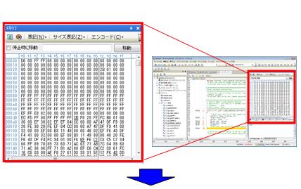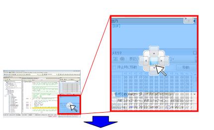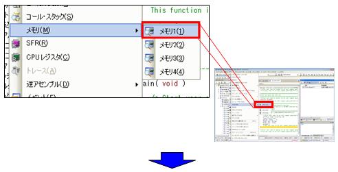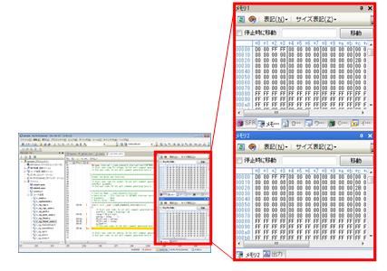 メモリ状態が表示されます。メモリ・パネルは4つありますが,今回は 2つを表示させます。 [メモリ1],[メモリ2]を同時に表示させると,デフォルトではタブ表示になり,どちらか一方しか見ることができません。これを,並べて見えるようにドッキングさせてみましょう。