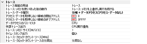トレース機能/リアルタイムRAMモニタ機能(RRM機能)は一部排他使用の機能です。このため,このプロパティで,どちらの機能を優先的に使用するかを指定します。ここでは,次のドロップダウン・リストより,[トレース]を選択してください。