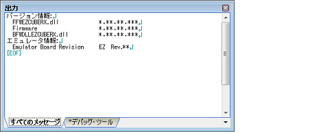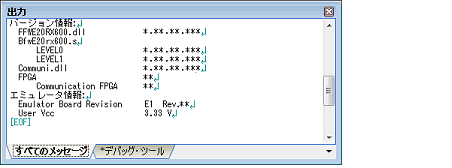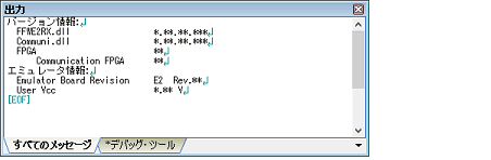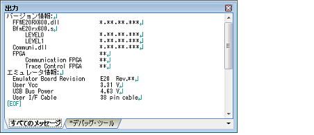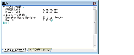 デバッグ・ツールとの接続に成功すると,エミュレータ・ファームウェアなどのバージョン情報および供給電圧などのエミュレータ情報を出力 パネルに表示します。