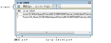 なお,各エリアの見方,および機能についての詳細は,コール・スタック パネルの項を参照してください。