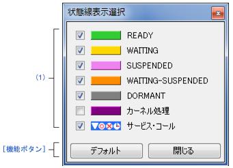 に処理プログラムの実行遷移状況として表示する状態線の種類,およびリアルタイムOS資源の利用状況として表示するイベント・マークの表示有無を設定します。