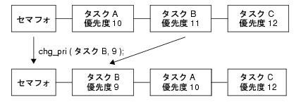 本サービス・コールは,tskpriで指定された優先度にしたがって対象タスクを待ちキューにつなぎかえます。待ちキューにtskpriで指定された現在優先度のタスクが複数ある場合は,対象タスクをそれらの中の最後尾につなぎかえます。