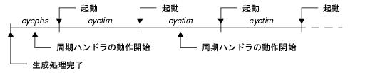 コンフィギュレーション時に定義した起動位相(初期起動位相cycphs,起動周期cyctim)で対象周期ハンドラに対する起動タイミング設定処理が行われます。