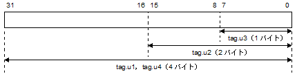 共用体はそのメンバがすべてオフセット0から始まり,そのメンバの任意のものを収容するのに十分なサイズを持つ構造体と考えられます。つまり,共用体型の内部表現は,同じアドレスに共用体の要素それぞれが単体で置かれているのと同様です。