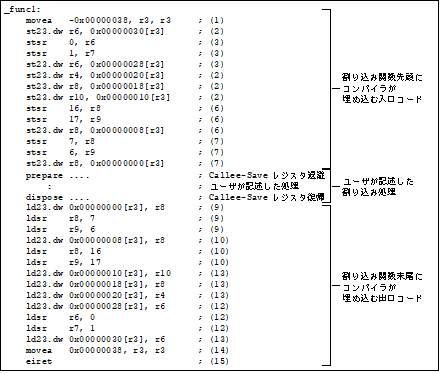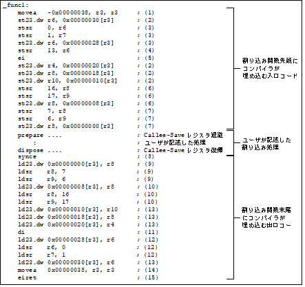 ただし,これらをすべての割り込み関数に挿入するわけではなく,ユーザの#pragma記述やコンパイル・オプション等に応じて必要な処理が出力されます。