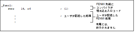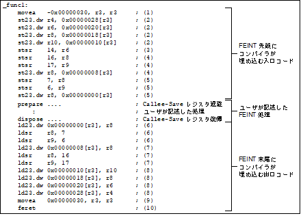 FEレベル例外の割り込み関数に対して,コンパイラが入口/出口に挿入する命令列を以下に示します。主に,FEINTやPIE等がこれに該当します。