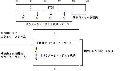 たとえば,サイズが20バイトの構造体引数を値渡しする場合,16バイトはr6~r9 で,残りの4バイトはスタック(5 番目のパラメータ・ワード)として渡されます。