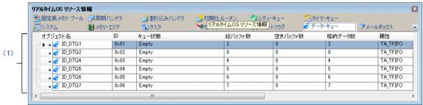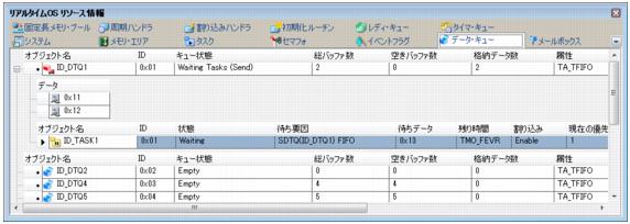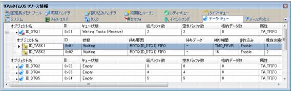 データ・キューにタスクがキューイングされている場合に限り,送信待ちタスク/受信待ちタスク情報(タスク名,IDなど)を表示します。